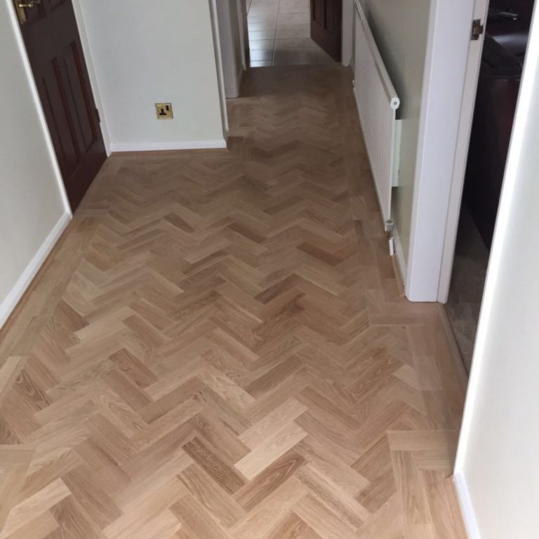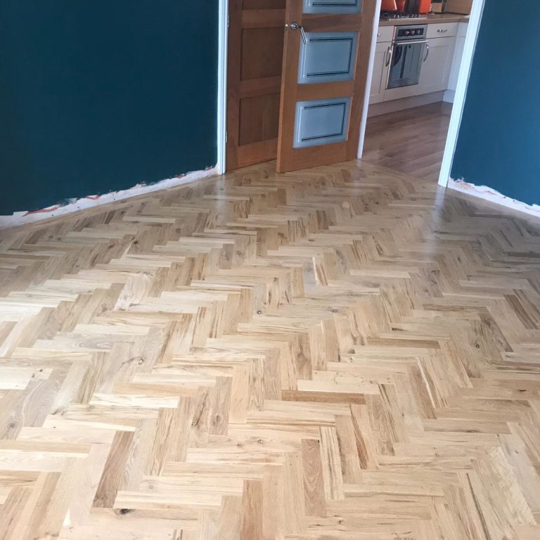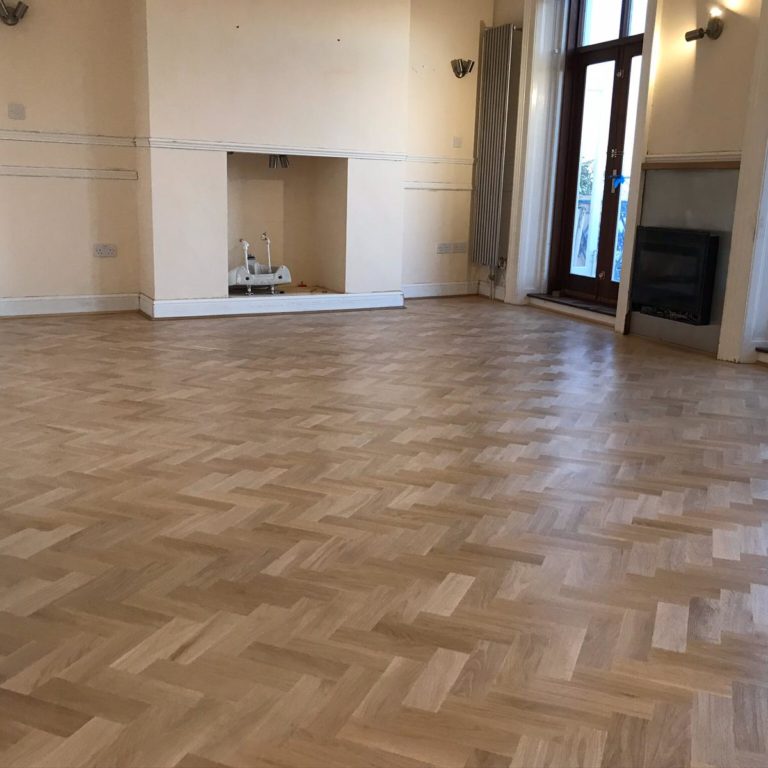 Oak parquet blocks have been fitted in wall to wall herringbone pattern, sanded and 3 coats of seal have been…