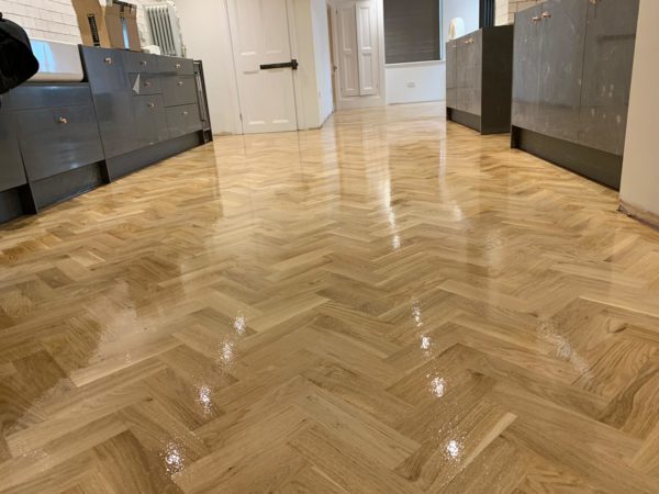 Unfinished Parquet solid oak supplied and fitted. Once installed the entire floor was sanded and completed with 3 coates of high traffic lacquer.
