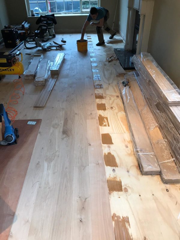 Oak strip supplied and fitted with hidden nails on a 18mm plywood base. The new floor had to match existing oak strip floors in the house. Once installed entide downstairs was sanded and completed with 3 coates of Junckers Strong.
