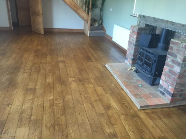 Solid teak parquet done in Wakefield. A bit of concrete area on the hall entrance has been removed, new parquet has been installed to fill the gap. Also, around fireplace there have been a few repairs to be done after the customer changed the hearth. Once all repairs were completed entire area has been sanded down and black Osmo oil has been applied. The floor was finishes with 1 coat of clear oil.