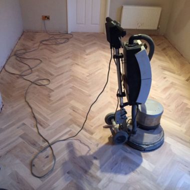 The engineered floor has been laid with flexible adhesive suitable for underfloor heating. After laying the floor was sanded to a very fine grit. A white primer has been applied to give the look of white wash Once the floor was dry lacquer has been applied.