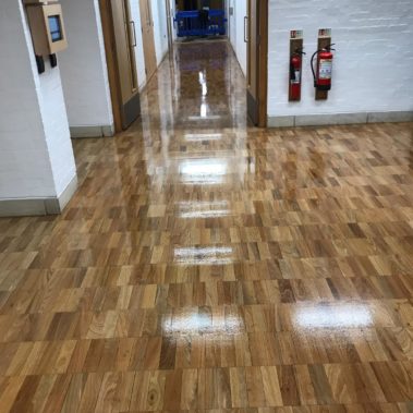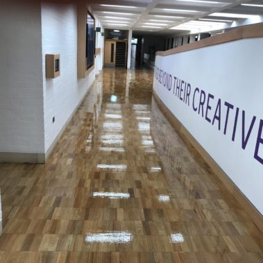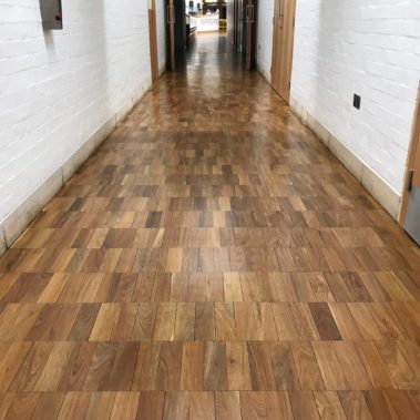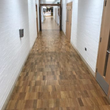 Hull University stairs restoration done by casing extended stairs with oak engineered planks. Also a small area of the corridor has been laid with parquet blocks. Once installed entire corridor at Larkin Building was sanded and 4 coates of high traffic lacquer was applied