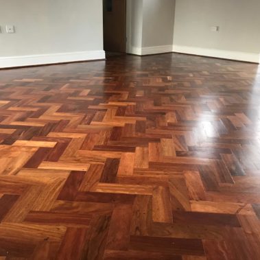 Solid mahogany parquet restored. Entire floor was sanded, we have used gap fillind to fill gaps caused by the curring of the material. Once sanded the floor was finished 3 coates of clear high traffic lacquer.