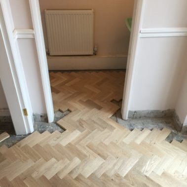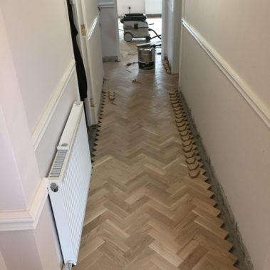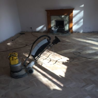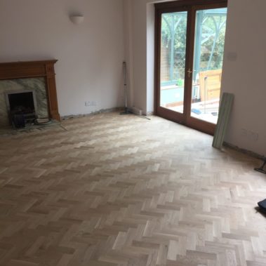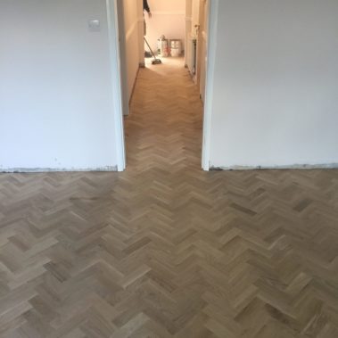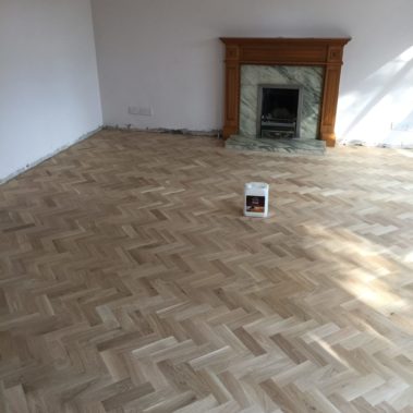 The parquet installation went according to plan. The parquet blocks were installed in a herringbone pattern on a plywood subfloor that we also supplied. The blocks were fixed in place using adhesive. Once installed the floor was sanded to fine grit, this has given the floor a smooth and even surface, and 3 coats of seal have been applied.