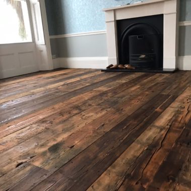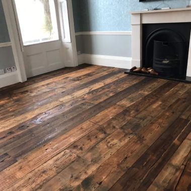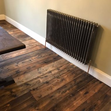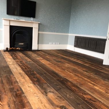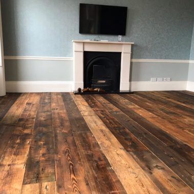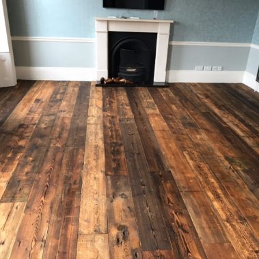 Straight edge reclaimed pine boards, layed on top of existing floor boards with a 4 mm plywood subfloor to stop draft coming thru. The floor was completed with 2 coates of clear Osmo oil.