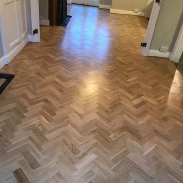 Solid oak parquet supplied and fitted in herringbone pattern wall to wall. Subfloor has been prepared with an 9mm plywood. Once installed the floor was sanded and completed with 3 coates of lacquer.