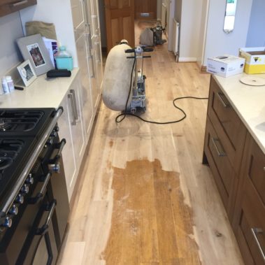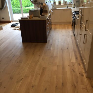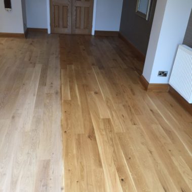 Engineered oak strip sanded, previously very worn. We have completed the floor for our customer with 2 coates of Osmo Oil.