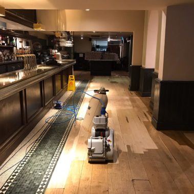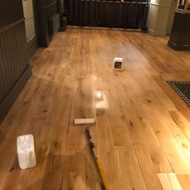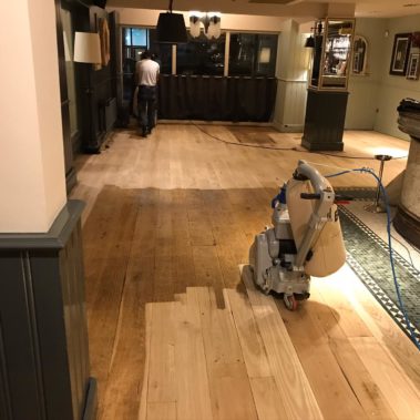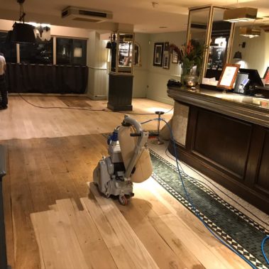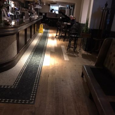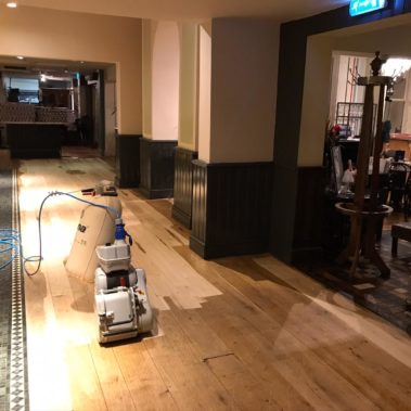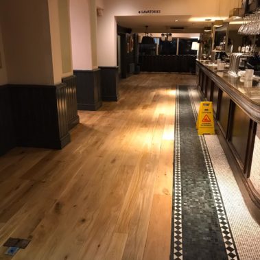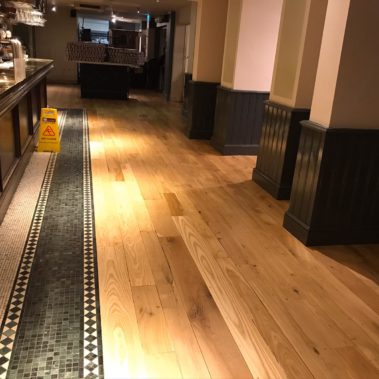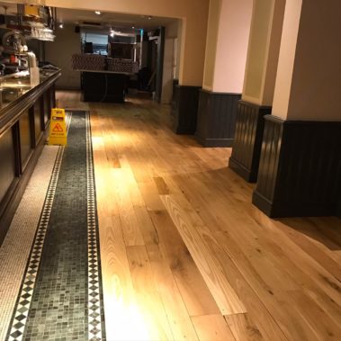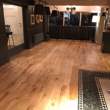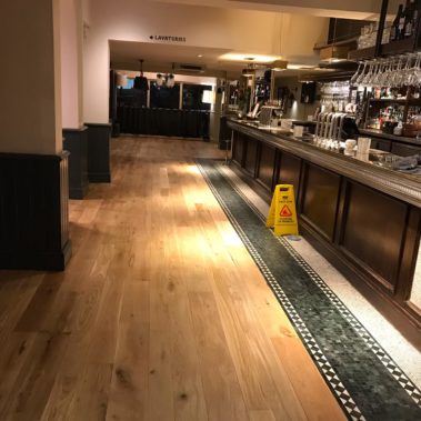 Tom Foolery Pub Boston Spa, a section around bar area has been affected by roof water leak and poped up, we had to lift damaged area up, level the base with self levelling compound, after it dried we supplied matching solid oak strip installed it and entire pub has been sanded and completed with 4 coates of Junckers Hp Commercial