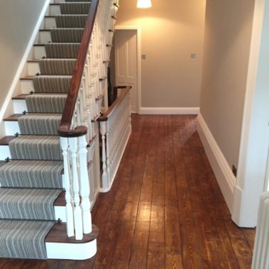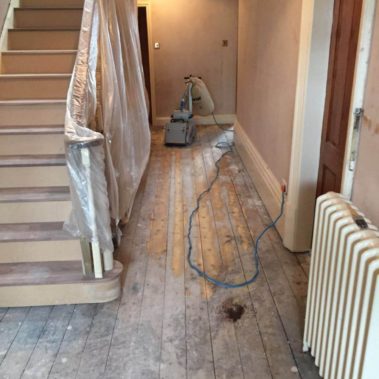 Engineered oak strip sanded, previously very worn. We have completed the floor for our customer with 2 coates of Osmo Oil.