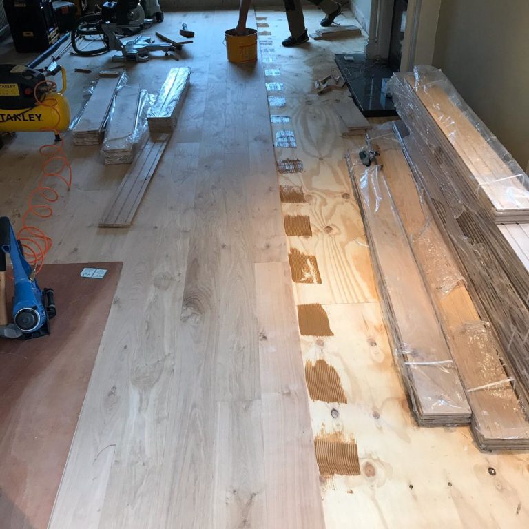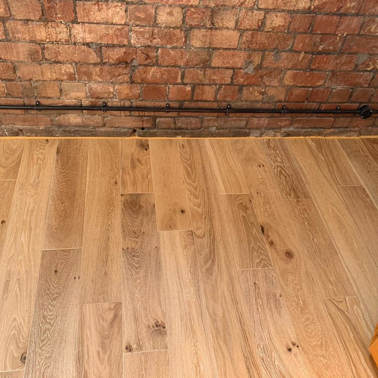 Unfinished solid oak strip supplied and fitted. The floor was laid on a plywood subfloor with hidden nails. Once fitted…
